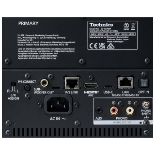Coppia Altoparlanti HiFi Wireless. 2 vie, bass reflex, Woofer conico 15 cm, Tweeter a ghiera 1,9 cm. Potenza 100W x2. Servizi di Streaming: Spotify Connect, Deezer, Amazon Music HD, Tidal, Qobuz, Internet Radio, Roon Ready. Bluetooth, AirPlay2. Ingressi: Phono MM, Aux In 3,5 mm, Ottico, USB-C (USB-DAC). Uscita HDMI (ARC), subwoofer. Connessione tra le 2 casse: Wireless o Cavo RJ-45 in dotazione 3 metri. App Technics Audio Center, telecomando e pulsanti sull'unità principale. Processore Jeno. Space Tune. Materiale in microfibra con una texture morbida. Orchestration: offre un'esperienza musicale di altissimo livello. Dimensioni (LxAxP) 201 x 313 x 276 mm