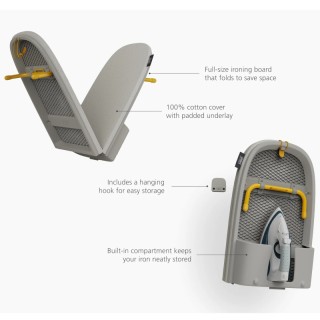 Asse da stiro pieghevole salvaspazio. Superficie da stiro di dimensioni standard da 110 cm (43"). Vano portaoggetti integrato per il ferro da stiro. Gancio di sospensione separato per una facile conservazione. Rivestimento in 100% cotone con sottostrato imbottito.